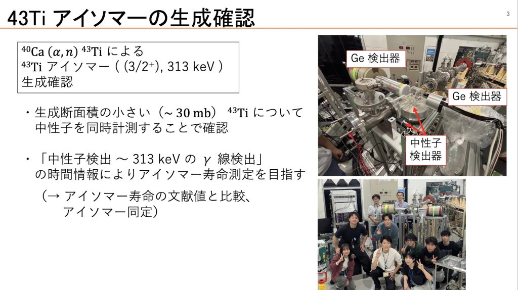 前回9月のコミッショニングと同様に Eコース終端までのビーム輸送を確認し、ビーム輸送計算との整合性を評価するデータを十分に取得した。また、アルファビームを 40Ca (natCa) 標的に照射し、今後調査予定の 43Ti アイソマーからのガンマ線と推定されるピークをオンラインで確認しました。